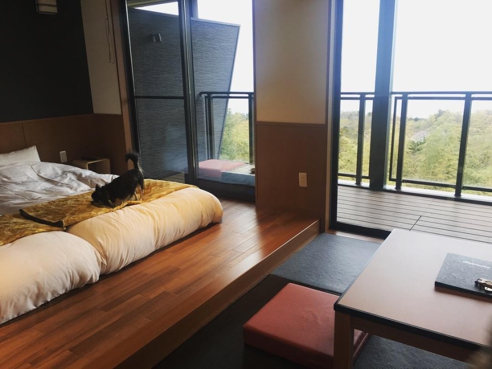 伊豆大島と竹林の景観がすばらしい全室オーシャンビューの愛犬と泊まれる伊豆の宿です。4部屋しかなく宿泊者は中学生以上、という年齢制限もあるので落ち着いた大人の雰囲気漂う隠れ家的スポット。露天温泉風呂もお部屋のテラスに付いているので、愛犬をお留守番させることなく飼い主さんもゆったりくつろげます。室内ドッグランやグルーミングルーム、ワンちゃん用メニューなど、愛犬へのおもてなしもばっちり。何よりわんちゃんも一緒に寝てOKで脚への負担が少ないローベッドが嬉しい。愛犬と行ける館内のレストランでは伊豆名産が堪能でき、中でも金目鯛の和風アクアパッツァが名物です。