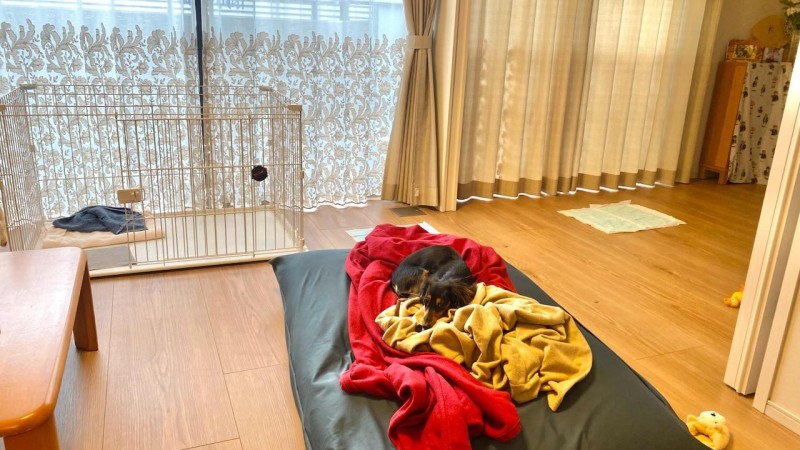今回で2回目のお願いで、別れ際こそ鳴いていたものの、すぐに安心して過ごさせて頂いたようです。ご夫婦ともに優しく温かいお人柄で、むぎもすっかりリラックスしてお腹を出して寝ていたようでした。