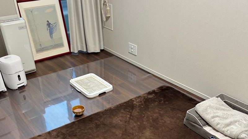 ペット可のマンションに住んでいて、18畳ほどのリビングと6畳のワンちゃん部屋で自由に過ごしてもらいます。 ペットカメラ設置してます。内廊下なので脱走の心配はありません。