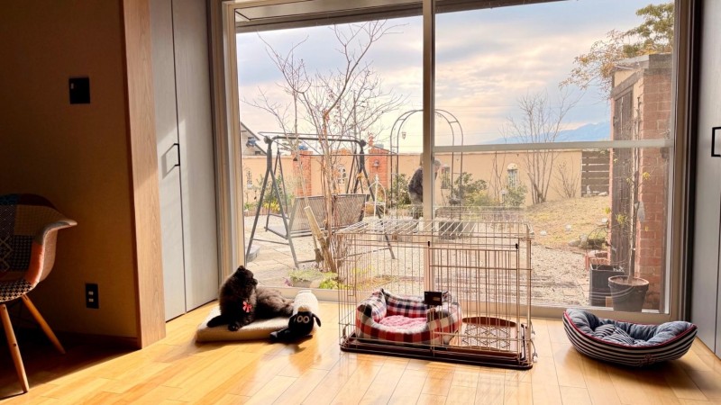 ワンちゃんが過ごすお部屋は南向きの広いリビングですお庭と繋がっている為 ご希望のワンちゃんは外リビングでも過ごして頂けます。 お昼寝や寝室はリビング奥の静かな環境にケージも設置してあります。 日頃愛用しているベットや布団など持ち込み可能ですのでご相談下さい。
